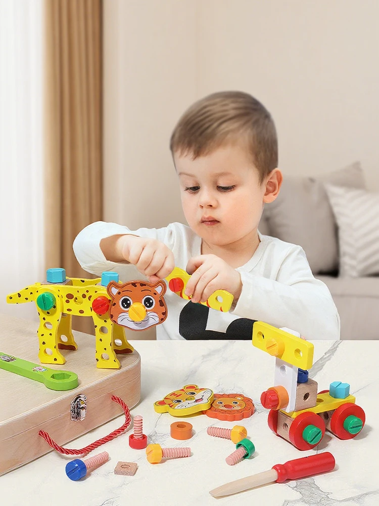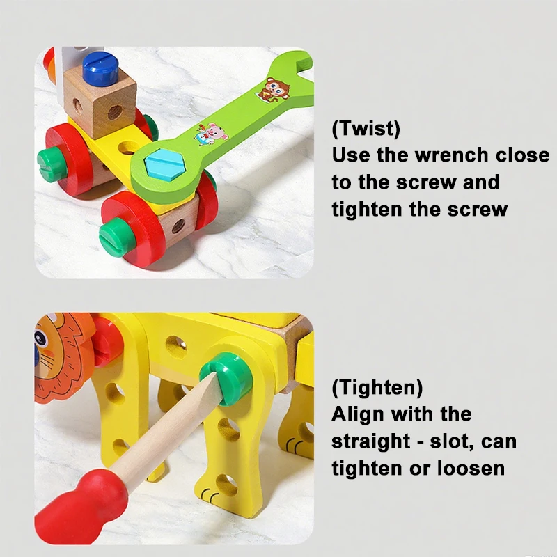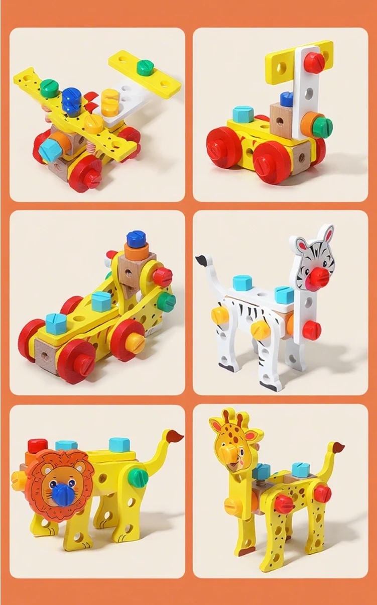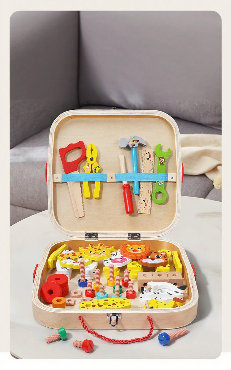 Ao desmontar e voltar a montar os animais, as crianças desenvolvem a coordenação motora fina, a coordenação óculo-manual e a capacidade de resolução de problemas. As cores vibrantes e os rostos amigáveis dos animais mantêm-nas entretidas, enquanto a estrutura robusta de madeira garante durabilidade. É um brinquedo educativo ideal para a primeira infância, que introduz conceitos básicos de engenharia e estimula a imaginação através de brincadeiras criativas do tipo "faça você mesmo". Seja para aventuras individuais ou para partilhar com os amigos, esta caixa de ferramentas proporciona horas de diversão educativa. Um ótimo presente para os mais pequenos explorarem, criarem e aprenderem!